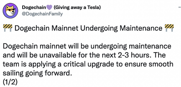 9月11日消息,Dogechain于今日宣布将进行主网维护,预计网络将停机2-3小时,并表示本次维护将进行关键升级,用户资金是安全的。 但据Dogechain官网数据显示,目前该网络已停机8小时,且官方社交媒体暂无任何更新说明。