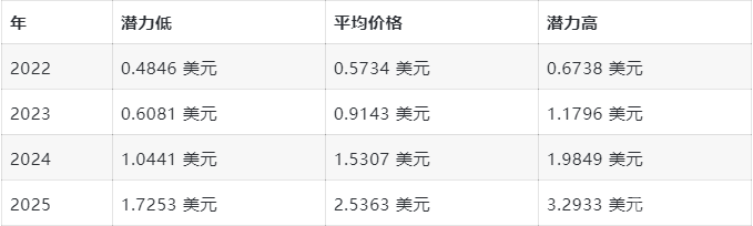 根据Tradingbeasts的算法分析。到2022 年底, Enjin 代币的最高价格预计为0.833 美元。该公司已将最低和平均价格目标分别定为 0.5670 美元和0.6670 美元。根据 Trading Beasts 的数据,ENJ 的价格可能会在 2023 年和 2025 年结束交易。其潜在高点为0.6850 美元和0.9688 美元。分别。