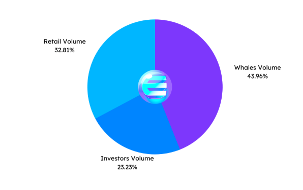 根据Into The Block的说法,Enjin 的交易量集中在鲸鱼、零售商和投资者手中。这对社区来说是一个压倒性的景象。而鲸鱼则以 43.96%的价格占据最大份额。零售商紧随其后,为32.81%,其次是投资者,份额为23.23%。随后,东西方之间的交易人口统计数据几乎持平,分别为52%和48%。