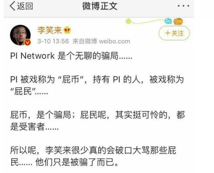 币圈大佬被免费蹭热度,那是绝对不可能的,于是李老师怒发此微博。直接指出 Pi Network是个无聊的骗局,不管李老师以前说过什么,但是这句话相信是真的!