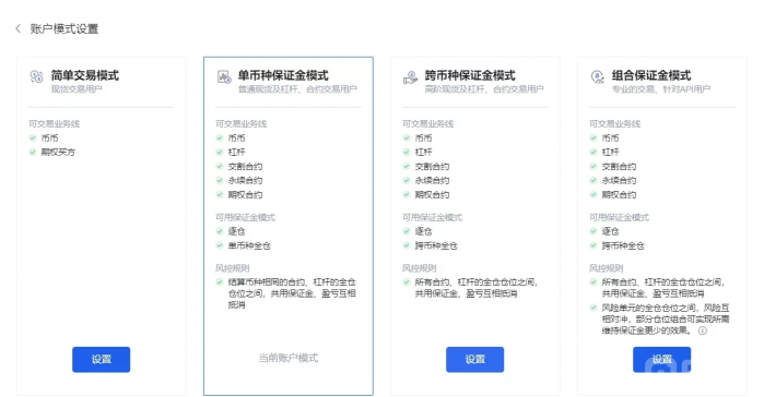2)受众单币种保证金模式:适合有交易经验的散户和量化用户选择,用户可在统一账户模式下点击“交易设置”按钮→设置账户模式→选择单币种保证金模式,完成之后答题即可激活。