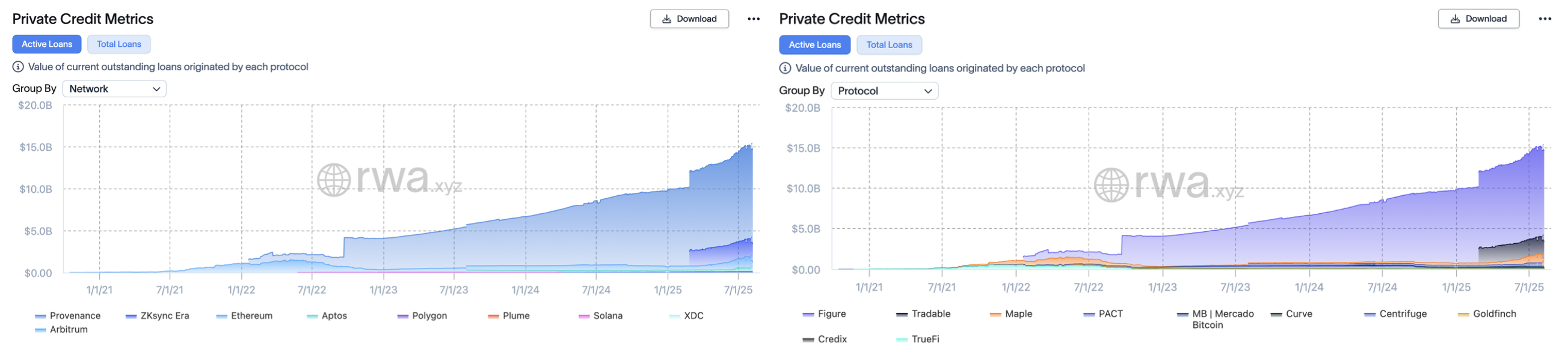 这一浪潮背后是传统机构的深度介入,其中占最大头的就是近期在讨论上市的 Figure,其推出的专为资产证券化与贷款金融场景而设计 的 Cosmos 生态链 Provenance,截止 2025 年 8 月 10 日 已托管约 110 亿美元私人信贷资产,占该赛道 75%。其创始人是前 SoFi 创始人 Mike Cagney,作为借贷领域的连续创业者,这也让他在区块链借贷中的得心应手,平台打通了贷款发起、token 化、二级交易的全链条。