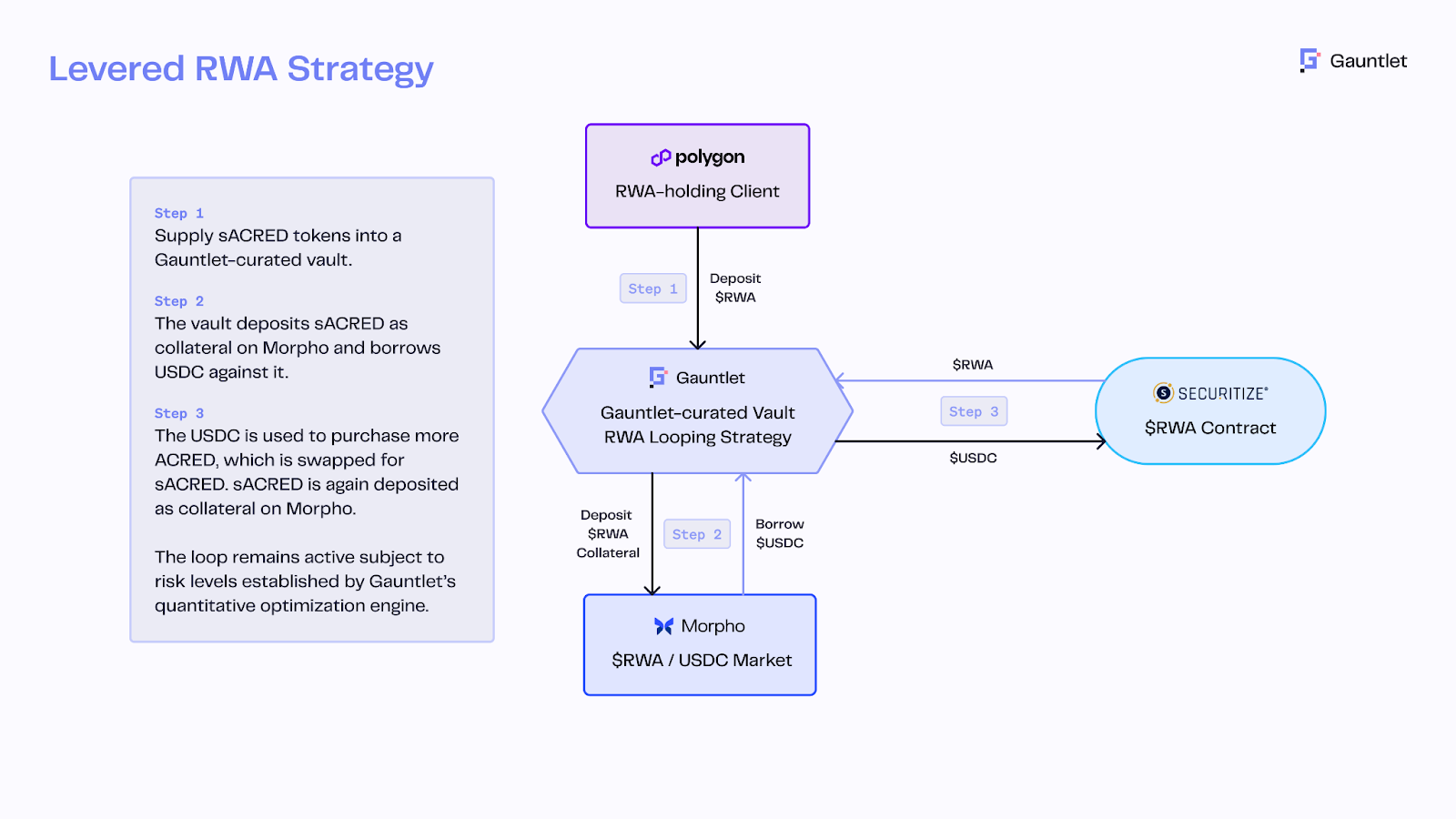 例如 Apollo 推出了其旗舰信贷基金 ACRED 的 token 化基金,允许投资者通过 Securitize 铸造 sACRED 代币代表其份额,再将该代币用于 DeFi 平台(如 Polygon 上的 Morpho)进行借贷套利操作。通过 RedStone 价格预言机和 Gauntlet 风控引擎,sACRED 被抵押借出稳定币,再加杠杆回购 ACRED,从而将 5–11% 的基础收益率杠杆化至 16% 年化。这一创新结合了机构信贷基金与 DeFi 杠杆。