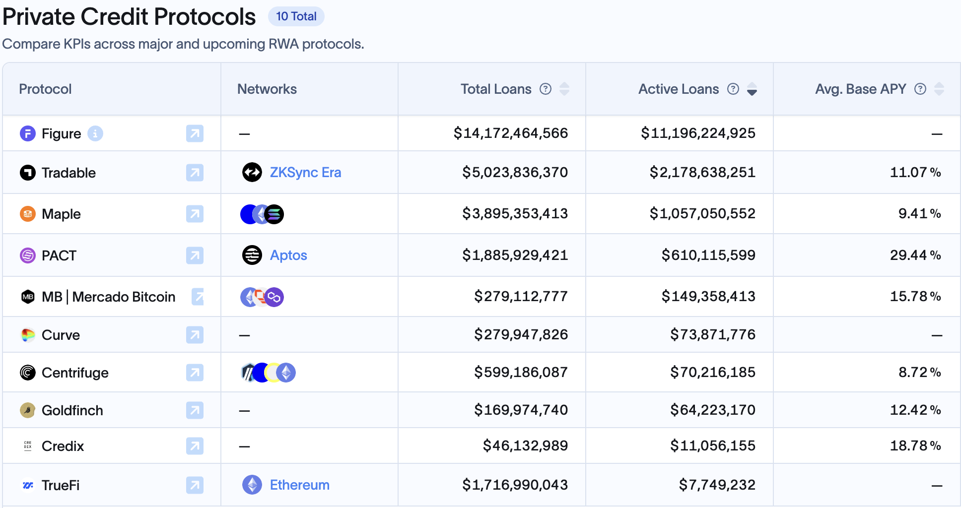 DeFi 原生平台也正进军 RWA 的借贷市场。例如 Maple Finance 已累计撮合超过 33 亿美元贷款,当前活跃贷款约 7.77 亿美元,部分面向现实应收账款。MakerDAO 也开始配置国债与商贷等现实资产,Goldfinch、TrueFi 等平台也早早布局。